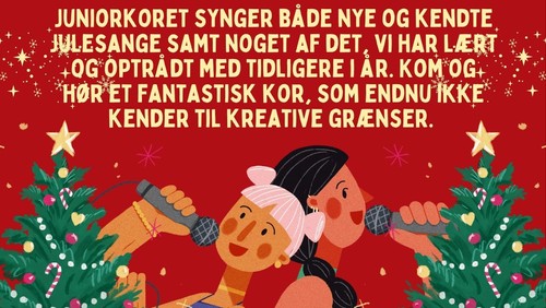 Lørdag d. 6. december kl. 16.00 synger Juniorkoret julekoncert i Høje Kolstrup Kirke. Foruden nye og kendte julesange synger koret også noget af det, vi har lært og optrådt med tidligere i år. Kom og hør et fantastisk kor, som endnu ikke kender til kreative grænser.