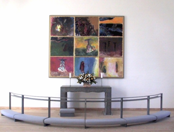 Det næste billede er mørket over Golgatha, der sænkede sig i Jesu dødsstund. Vi bemærker, at korsene har en vis lighed med galger. Igen en understregning af den evangeliske samtidighed: Det er os her og nu, det handler om. Guds ord kan vi aldrig sende videre til dem, vi måtte mene har mere brug for det end vi selv har. Gør vi det, har vi ikke forstået noget som helst.
