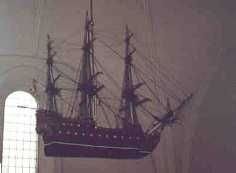 I den nordlige korsarm hænger et kirkeskib fra 1700-tallet, en fregat med to rækker kanoner langs bagbords og styrbords side samt to kanoner i agterstavnen. På agterspejlet holder to vildmænd kong Frederik den Femtes monogram i et kronet felt.