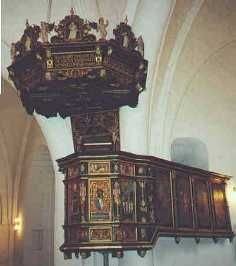 Prædikestolen fremtræder i ungrenæssance; den er opsat år 1565, mens baldakinen (himlen) over prædikestolen er fra 1626.